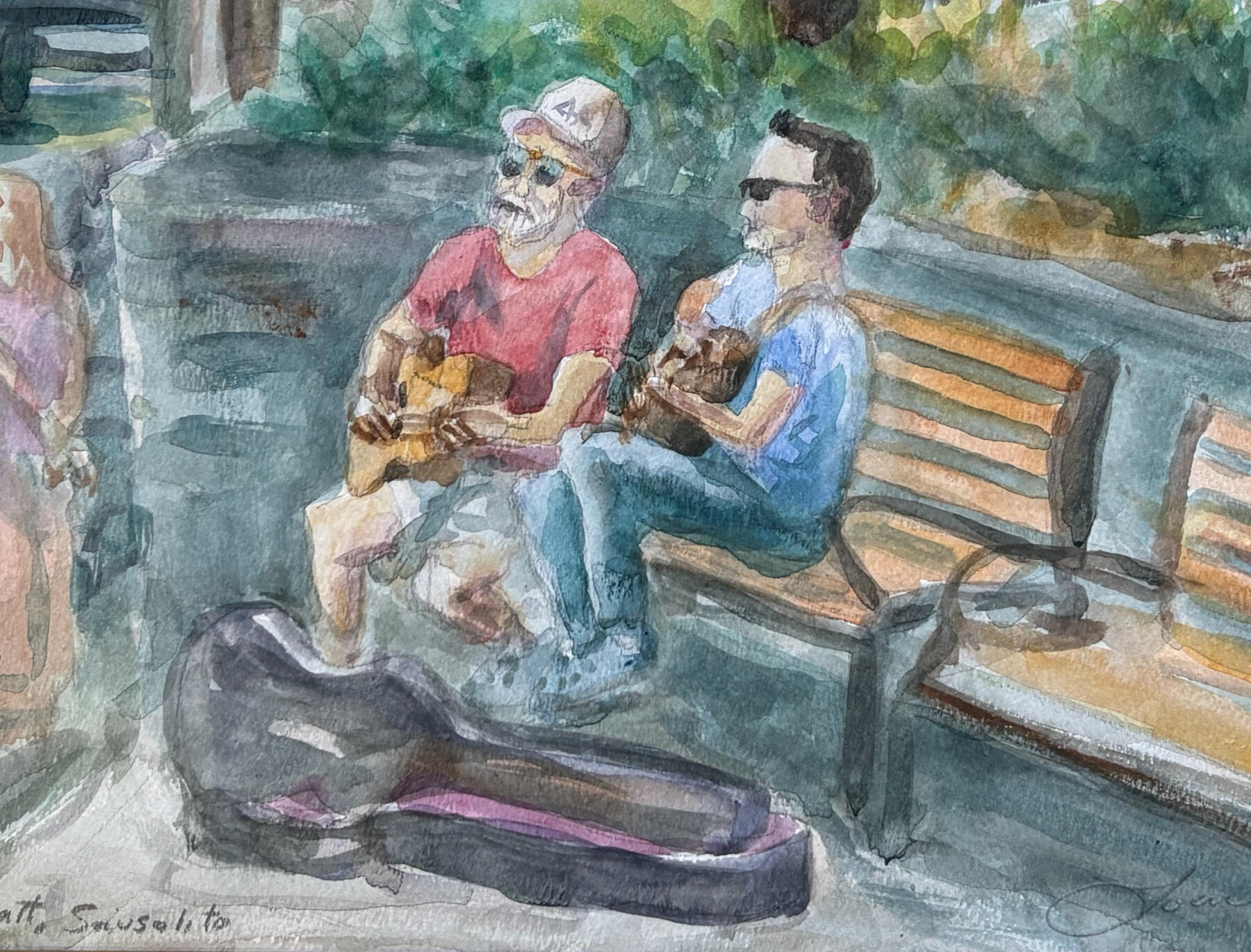 “We need more music in our lives” — Matty J., September 2024That off-hand line, dropped after an open mic session ended up launching this Bay Area acoustic duo. It followed the discovery that one of Matty’s best friends and former roommates, Scotty, had been quietly working on guitar and vocals. Weekly living room jams suddenly became a thing: two acoustic guitars, a shared love of classic rock, folk, and grunge, and a growing list of “wait, we should totally play this one” songs.One especially perfect afternoon took those sessions to a Sausalito park overlooking the SF Bay. They opened their cases and started playing. People didn’t just stroll by — they stopped and stayed. A few tossed in cash. And an awesome local artist, Lucinda Eubanks, even captured the moment in watercolor, which now lives as part of Just the One’s visual story.